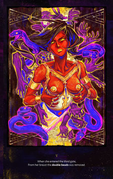 Undaunted, she puts on seven holy garments. Each garment is a representation of a powerful mes* she possesses. Every time Inanna passes through a gate, she needs to remove one garment she wear, thus stripping her power. At the end of the journey, Inanna is naked, and she dies because of being given the eye of death. However, in this work, death is not the end of Inanna, but she will be reborn in her blood and return triumphantly as a goddess.